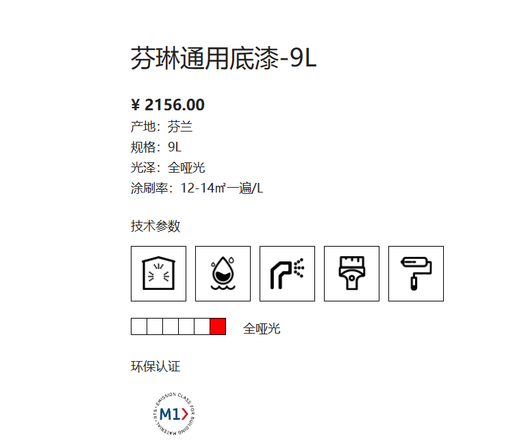水性哑光丙烯酸底漆。适用于内墙和天花板等处。附着力强,抗酸碱,为其后涂刷芬琳系列内墙漆打下良好的基础。用作室内底漆,用于内墙和天花板上。